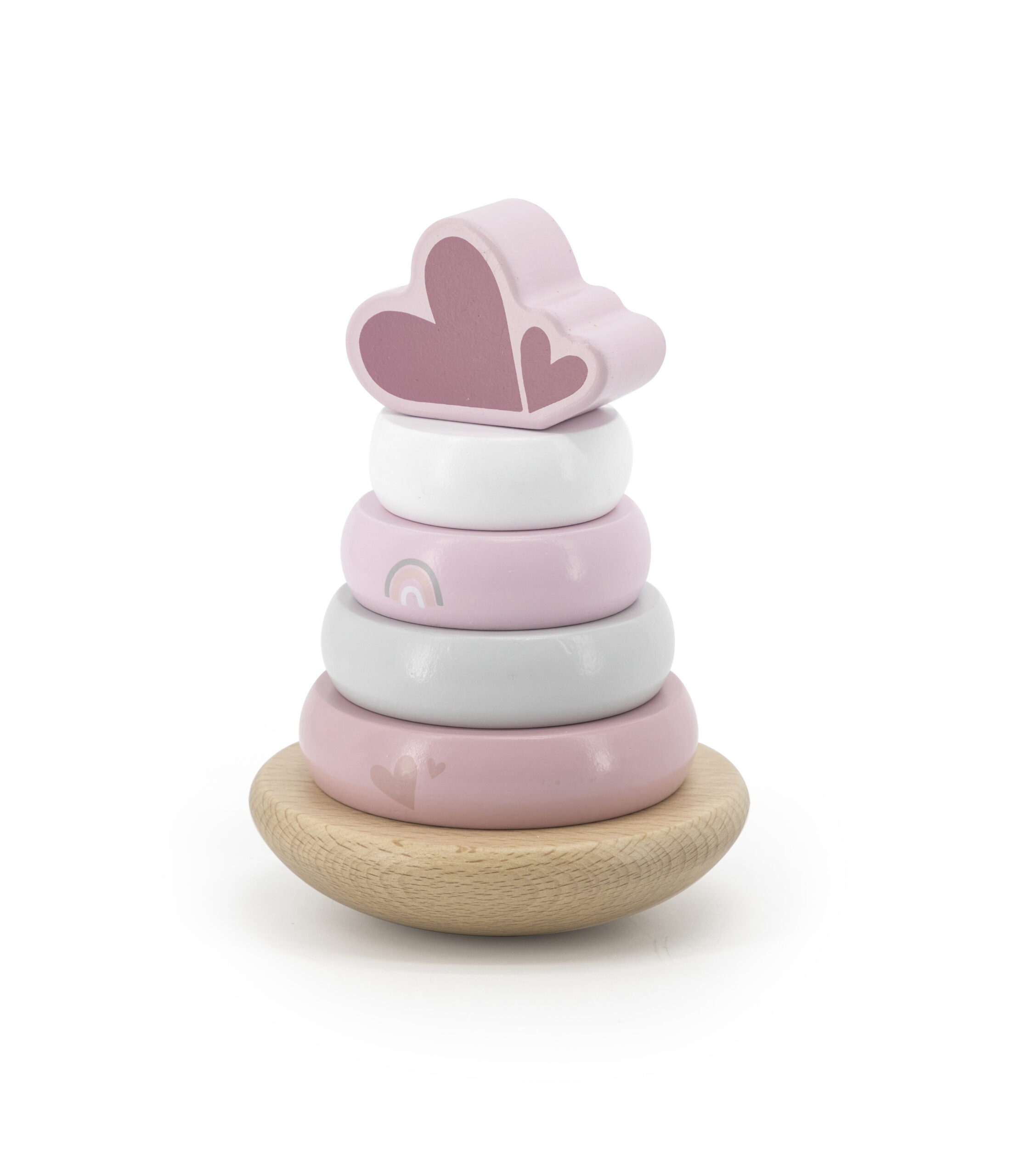 De piramide op schommelbasis is vervaardigd uit kwaliteitsvol FSC gecertificeerd beukenhout en werd voorzien van prachtige zachte tinten met behulp van kindvriendelijke verf op waterbasis. De stapelringen en topblok kregen een leuk symbool.