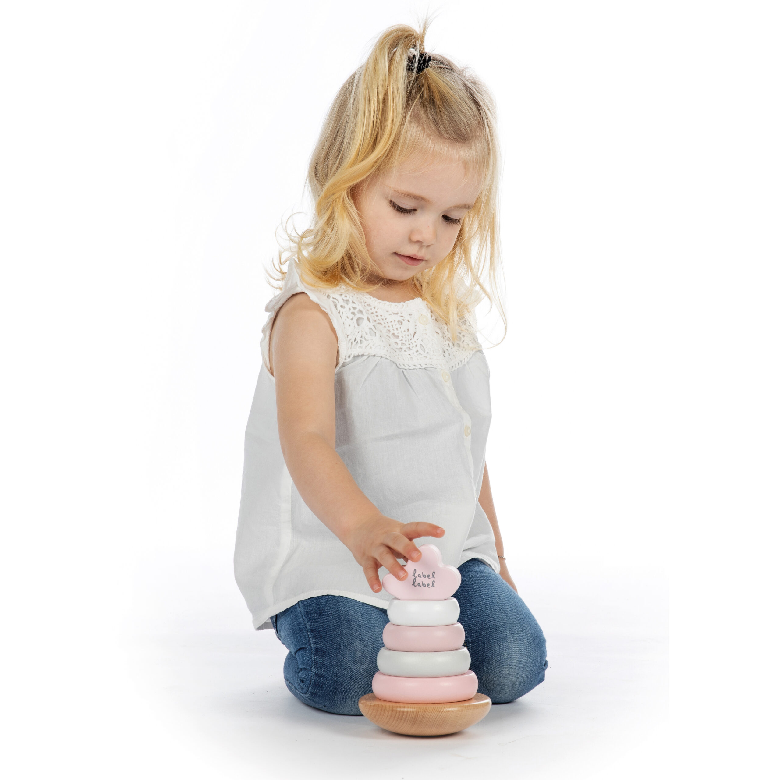 De houten ringen en topblok zijn makkelijk vast te nemen voor de kleine handjes. Stapelen van groot naar klein of van klein naar groot of sorteer de kleuren… uw kindje kan zelf beslissen wat die leuk vindt en ondertussen oefent hij/zij de hand-oog coördinatie en redeneringsvermogen.